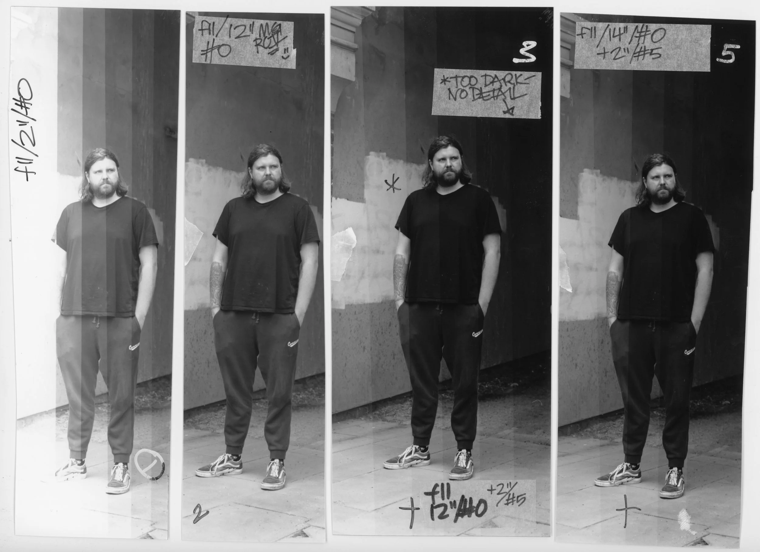 Above: A comparison test strip to see what effect a 3 sec and 4 sec filter #5 had on the darker clothing. It’s subtle.